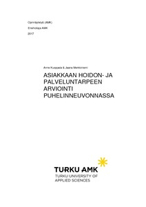 Tämän opinnäytetyön tarkoituksena on antaa kattava kuvaus siitä millaisia tietoja ja taitoja perusterveydenhuollon sairaanhoitaja tarvitsee pystyäkseen tekemään tehokkaasti ja kattavasti hoidon- ja palveluntarpeen arvioinnin asiakkaalle puhelimitse. Lopputuotoksena tehtiin prosessikaavio, jonka tarkoituksena on helpottaa terveydenhuollon ammattilaisen päätöksentekoa puhelimitse.