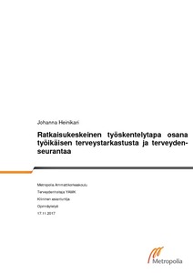 Opinnäytetyön tarkoituksena oli kuvata työterveyshoitajien kokemuksia ratkaisukeskeisen työskentelytavan toteutumisesta terveystarkastuksessa ja terveydenseurannassa. Tarkoituksena oli myös selvittää ratkaisukeskeisellä työskentelytavalla toteutetun terveystarkastuksen ja terveydenseurannan eroja verrattuna perinteisellä tavalla toteutettuun terveystarkastukseen ja terveydenseurantaan. Tavoitteena oli tuottaa tietoa ratkaisukeskeisestä työskentelytavasta terveystarkastuksessa ja terveydenseurannassa sekä ratkaisukeskeisen työskentelytavan kehittämiseksi työterveyshoitajan työssä.