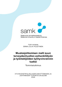 (2026)Hyvinvointialuemuutos on tuonut merkittäviä työelämään vaikuttavia muutoksia, joilla on ollut vaikutuksia työntekijöiden työhyvinvointiin ja esihenkilötyöhön. Opinnäytetyön tarkoituksena oli selvittää suun terveydenhuollon ...