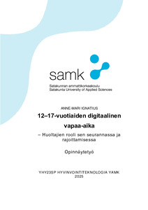 (2025)Opinnäytetyössä tutkittiin 12–17-vuotiaiden digitaalista vapaa-aikaa huoltajien näkökulmasta sekä heidän keinojaan sen rajaamiseen ja seurantaan. Aineisto kerättiin verkkokyselyllä, joka jaettiin Poikien äidit -yhteisön ... -