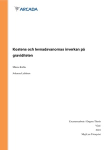 Respondenterna har valt att i en medicinsk infallsvinkel forska genom en kvalitativ innehållsanalys hur graviditeten påverkas av den gravida kvinnans kost och levnadsvanor. Respondenterna har samlat in information angående studien genom litteratursökning. Respondenterna lyfter fram kostens betydelse både för den gravida kvinnan samt fostret hon bär på. Med hjälp av litteraturanalysen forskade respondenterna även inom problem relaterade till kost under graviditetstiden. Som teoretiskt referensam har re-spondenterna använt sig av Katie Erikssons Hälsans idé (1990), hälsa är ”sundhet”, ”friskhet” och ”välbefinnande” samt hälsa är integration. Resondenterna har avspeglat den teoretiska referensramen längs litteraturbearbetningsprocessen. Syftet med studien var att lyfta upp olika näringsrekommendationer. Examensarbetet lyfter upp näringens betydelse och dess problematik längs graviditetstiden. Respondenterna koncentrerade sig även i problematik som kan förorsakas av en felaktig kost hos den gravida kvinnan, vilket i sin tur leder till desintegration. Examensarbetet har som infallsvinkel att vägleda den gravida kvinnan med hjälp av att rätta kost och levnadsvanor nå ett integrerat tillstånd. Motion och sömn har även en centrall roll för en lyckad graviditet, men för att begränsa ämnesinnehållet har respondenterna valt att koncentrera sig på kostens bety-delse samt i ett stycke kort ta upp motionens betydelse under graviditeten. Frågeställningarna respondenterna utgår ifrån relateras till kvinnans kost och levnadsvanor, information om kost under graviditeten och problem relaterat till kost under graviditeten. The respondents have chosen to use a medical approach to the research trough a qualita-tive literature analysis of how pregnancy is affected by the pregnant woman’s eating hab-its and way of living. The respondents have gathered information about the study through a literature search. The respondents highlights the importance of food for the pregnant woman herself and the fetus she carries. With the help of literary analysis the respondents also did a research related to problems with food and way of living during pregnancy. As a theoretical frame the respondents have used Katie Eriksson’s idea of Health (Hälsans idé 1990), health is “soundness”, “freshness” and “welfare” and health is integration. The respondents have reflected the theoretical frame along the processing of literature. The purpose of this study was to highlight various nutrition recommendations. The thesis highlights the importance of nutrition and its problems along the pregnancy. The respon-dents also concentrated in the problems that can be caused by an incorrect diet of the pregnant woman, which in turn leads to disintegration. The thesis is approached to guide the pregnant woman by using the right diet and lifestyle to reach an integrated state. Ex-ercise and sleep also has a central role in a successful pregnancy. To limit the subject matter, the respondents chose to focus on the importance of diet and in one chapter briefly write about the importance of exercise during pregnancy. The respondents ques-tions are based on woman’s diet and lifestyle, information about nutrition during preg-nancy and problems related to diet during pregnancy.