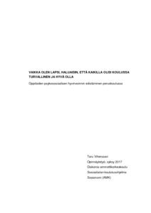 Vihersaari, Taru. ”Vaikka olen lapsi, haluaisin, että kaikilla olisi koulussa turvallista ja hyvä olla” - oppilaiden psykososiaalisen hyvinvoinnin edistäminen peruskoulussa. Kevät 2018, 152 s. ja 5 liitettä. Diakonia-ammattikorkeakoulu, sosiaalialan koulutusohjelma, sosionomi (AMK).
