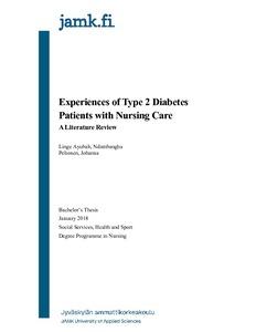 Tutkimuksen tavoitteena oli tutkia tyypin 2 diabetespotilaiden kokemuksia saadusta hoitotyöstä kirjallisuuteen pohjautuen. Tutkimuksen tarkoituksena oli tuottaa tietoa sairaanhoitajille ja tietoa voi hyödyntää tyypin 2 diabeteshoidon kehittämisessä.