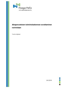 Työn tavoite oli selvittää, miten aikaperusteinen toimintolaskenta soveltuu ravintolan johtamisen työkaluksi kannattavuuden näkökulmasta. Loppujen lopuksi halusin vastauksen kysymykseen, mitkä asiakkaat ja tuotteet ovat kannattavia ja miksi. Työ oli kvantitatiivinen toimintatutkimus. Työ tehtiin kevään 2018 aikana ja se tulee olemaan apuna itselleni esimiestyössä.