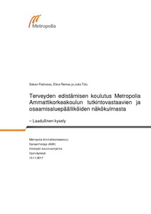 Tämän opinnäytetyön tarkoituksena oli selvittää avoimen kyselyn avulla Metropolia Ammattikorkeakoulun tutkintovastaavien ja osaamisaluepäälliköiden näkemyksiä terveyden edistämisen koulutuksesta. Tämä opinnäytetyö on osa kansainvälistä Health Promotion Program -hanketta, jonka tarkoituksena on terveyden edistämisen osaamis- ja koulutustarpeiden kartoittaminen. Tavoitteena hankkeessa on saatujen tulosten hyödyntäminen eri tutkintoalojen terveyden edistämisen osaamisen kehittämisessä suunnittelemalla ammatti- ja ammattikorkeakouluihin uusia opintojaksoja.