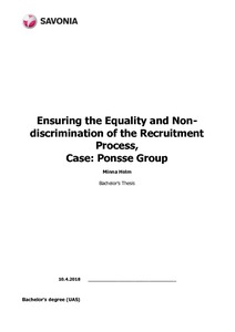 The purpose of the research was to explore and present proposals on how to ensure equality and non-discrimination in recruitment in the future at Ponsse Group in accordance with legislation, Ponsse Corporate Social Responsibility program and the code of conduct. The objectives of the study were to explain the personal views of Ponsse’s Human Resources professionals about equality and non-discrimination and how it is applied in the recruitment process, as well as to analyze the similarities and differences between the given descriptions.