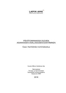 Opinnäytetyömme tavoitteena on työ- ja päivätoiminnan laatukriteereihin perustuen edistää asiakkaiden osallisuutta ja itsemääräämisoikeutta Hanhilehdon toimintakeskuksessa. Opinnäytetyömme tarkoituksena on toiminnallisin keinoin kehittää toimintakeskuksen toimintaa osallistamalla asiakkaita toiminnan suunnitteluun ja suuntaamalla toimintaa talon ulkopuolelle. Asiakkaiden kanssa toteutettiin kolme uudenlaista toimintaa sisältävää teemapäivää, joiden tarkoituksena on toimia konkreettisina esimerkkeinä toimintakeskukselle siitä, miten asiakkaiden osallisuutta ja itsemääräämisoikeutta voidaan edistää. Tavoitteenamme on, että toiminnasta jäisi konkreettinen hyöty toimintakeskukselle ja teemapäivissä käyttämiämme keinoja hyödynnettäisiin keskuksessa myös jatkossa.