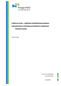Opinnäytetyöni seuranta kohdistui lukuvuodelle 2016–2017, jolloin Siuntion Liikkuva koulu -toiminta käynnistettiin Aluehallintoviraston myöntämällä kehittämisavustuksen määrärahoilla. Muodostimme Liikkuva koulu -työryhmän, johon kuului vähintään yksi koulukohtainen edusta-ja sekä hallinnon suunnittelija, joka toimi ryhmän vastuuohjaajana. Päiväkirjamerkintöjen avul-la kerron miten Liikkuva koulu -toiminta käynnistyi meidän kouluissamme, mitä hankeavus-tuksen määrärahojen käyttö vaatii ja toteutuiko hankeavustuksen määrärahojen käyttö toimin-tasuunnitelman mukaisesti. Hankkeen tärkeimpiä tavoitteita oli käyttää määrärahat toiminta-suunnitelman mukaisesti ja yrittää saada kehittämisavustusta myös kärkihankkeen tuleville lukuvuosille.