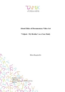 The topic of the written part of my thesis is about ethics of documentary video art. The practical – artistic - part of my thesis is also based to this study, I worked on a documentary video art piece “Veljeni” and used the knowledge I gathered for this written part. I studied the boundaries and limits in video art, ethics and law in it. The main focus is on whether documentary film can be called video art and where does the line of appropriateness go when filming someone else’s personal life.
