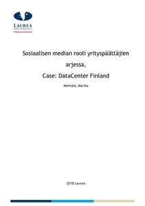Tämä opinnäytetyö käsittelee B2B-markkinointia ja sosiaalista mediaa. Opinnäytetyö tehtiin toimeksiantajalle, joka on it-alalla toimiva pilvipalveluiden, jatkuvuuspalveluiden ja asiantuntijapalveluiden yritys DataCenter Finland. Tutkimuksen tavoitteena oli saada tietoa opinnäytetyön toimeksiantajalle budjetointiin, jotta nähtäisiin mihin sosiaalisen median kanaviin kannattaa sijoittaa enemmän ja mihin vähemmän. Näiden tavoitteiden pohjalta toivottiin lisäksi, että työn valmistuttua toimeksiantaja pystyisi kehittämään yrityksen markkinointia ja erityisesti sosiaalista mediaa entistä paremmin. Kehitysehdotukset suunniteltiin erityisesti toimeksiantajalle, mutta tutkimuksesta saatuja tietoja voidaan käyttää hyödyksi muissakin B2B-yritysten markkinoinnissa.