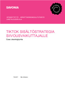 (2025)Opinnäytetyön aiheena on TikTok- sisältöstrategia siivousvaikuttajalle @cleaningbymiia. Opinnäytetyön toimeksiantajana toimii työn tekijä itse, sillä kyseessä on hänen oma sosiaalisen median kanava. Vaikuttajatilille on ... -