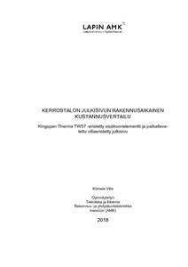 Opinnäytetyön toimeksiantajana oli YIT Rakennus Oy. Työn tavoitteena oli tehdä kustannusvertailu ja vertailla toteutustapaa kahden eri julkisivuratkaisun välillä. Vertailussa olivat Kingspan Therma TW57 -julkisivueristeellä eristetty sisäkuoribetonielementti ja paikallavalettu PAROC Cortex One -villaeristetty sisäkuoribetoniseinä. Therma TW57 -eristetty sisäkuorielementti oli toimeksiantajan käytössä Torniossa ensimmäistä kertaa Jopparin Kulma-projektissa, ja siitä haluttiin syvempää tarkastelua toteutuneen tiedon vähäisyydestä johtuen.