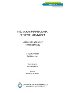 Opinnäytetyö toteuttiin toiminnallisena.Työn viitekehys rakentuu lasten ylipainon ennaltaehkäisyn tutkimustiedoista ja Neuvokas perhe-ohjausmenetelmästä tuotuna osaksi perhevalmennusta. Opinnäytetyössä selvitetään näiden työmenetelmien yhtenäisyyksiä ja toisiaan täydentäviä merkityksiä. Keskeisiä käsitteitä ovat perhekeskeisyys, motivoiva keskustelu, varhainen vuorovaikutus ja vertaistuki.