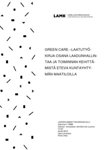 Kehittämishankkeessa tuotettiin Green Care -laatutyökirja osaksi sisäistä laadunhallinnan kehittämistä Eteva kuntayhtymän maatiloille. Green Care -laatutyökirjan tehtä-vänä on kuvata maatilojen toimintaa ja luontolähtöisten menetelmien käyttöä asiakkai-den fyysisen, psyykkisen ja sosiaalisen hyvinvoinnin tukena. Laatutyökirjan tarkoituksena on toimia laadunhallinnan ja johtamisen yhtenä työvälineenä.