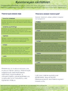 Opinnäytetyön toiminnallinen osuus oli mielenterveyden edistämistä esittelevän posterin tekeminen pääkaupunkiseudun Validia-talojen henkilökunnan käyttöön. Posteri laadittiin kirjallisuuskatsauksen tuloksiin perustuen.