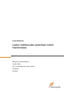 Insinöörityön tavoitteena oli selvittää, olisiko lisätyn todellisuuden (augmented reality, AR) mainonta uusi potentiaalinen tuote yrityksen mobiilimainosmuotoihin. Työssä selvitettiin display-mainonnan taustoja, lisätyn todellisuuden teknologiaa sekä näiden kahden yhdistämistä tulevaisuudessa mainonnan tuotteeksi. Lisäksi toteutettiin kaksi erilaista kyselyä, joiden tuloksista pystyisi päättelemään, ovatko käyttäjät ja tekniikka valmiita vastaanottamaan lisätyn todellisuuden mainontaa.