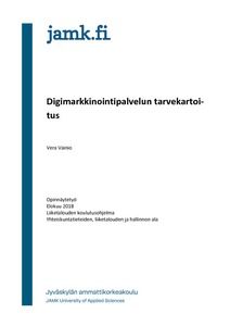 Opinnäytetyön tutkimusaiheena oli digimarkkinointipalvelun tarvekartoitus. Idea tutkimukseen lähti tutkijan ajatuksista oman yritystoiminnan perustamisesta. Tutkimuksen tehtävänä oli selvittää muotialan mikroyritysten nykytilaa sekä kiinnostusta hankkia digimarkkinointipalveluja ulkopuoliselta taholta. Tutkimuksessa selvitettiin myös yritysten ajatuksia palveluntarjoajan ominaisuuksista sekä palvelujen hinnoittelusta. Tavoitteena oli saada kuva siitä, olisiko kohdeyrityksillä tarvetta ja halua ostaa palveluja, mikäli tutkija aloittaisi yritystoiminnan liikeideallaan.