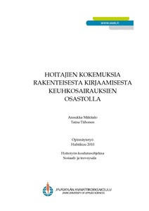 Opinnäytetyön tavoitteena on selvittää hoitajien kokemuksia rakenteisesta kirjaamisesta ja sen käytöönotosta. Tutkimuksen tarkoituksena on antaa työvälineitä kehittää hoidon laatua hoitotyön päätöksenteon prosessimallin mukaisesti.