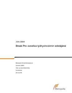 Insinöörityössä tutkittiin, onko Suomen Pankissa ja Finanssivalvonnassa käytettävällä Break Pro -taukoliikuntasovelluksella vaikutusta henkilöstön työhyvinvointiin. Tavoitteena oli saada tietää, onko sovelluksesta hyötyä ja käytetäänkö sitä ylipäätään. Vaikutusta työhyvinvointiin tutkittiin Microsoftin Office 365 -alustan Forms-sovelluksella tehdyllä kyselyllä. Siinä kartoitettiin, käytetäänkö sovellusta ja koetaanko se hyödylliseksi. Kyselyn tuloksia käytettiin yksilöhaastattelun kysymysten luomiseen. Haastatteluilla oli tarkoitus tukea ja syventää kyselystä saatua tietoa. Tuloksia analysoitiin tilastollisesti RStudio-ohjelmistolla.