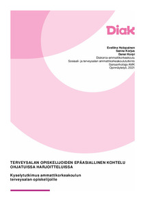 (2021)Eveliina Holopainen, Sanna Korjus & Danai Korpi Terveysalan opiskelijoiden epäasiallinen kohtelu ohjatuissa harjoitteluissa 34 sivua ja 2 liitettä Syksy, 2021 Diakonia-ammattikorkeakoulu Sosiaali- ja terveysalan ... -
