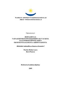 Tämän opinnäytetyön tarkoitus oli kartoittaa Pirkanmaan Hoitokodin potilaiden saamaa eksistentiaalisen ahdistuksen kohtaamista hoitajien ja vapaaehtoistyöntekijöiden näkökulmasta. Opinnäytetyön tavoite on kehittää potilaan eksistentiaalisen ahdistuksen kohtaamista Pirkanmaan Hoitokodissa. Tutkimus toteutettiin Pirkanmaan Hoitokodissa. Tutkimusongelmat olivat: millä tavoin potilaiden eksistentiaalinen ahdistus tunnistetaan saattohoitotyössä hoitajien ja vapaaehtoistyöntekijöiden näkökulmasta sekä mitä ovat potilaan eksistentiaalisten ahdistuksen auttamisen keinot hoitajien ja vapaaehtoistyöntekijöiden näkökulmasta?
