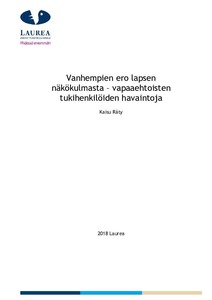 Tämän opinnäytetyön tarkoituksena oli selvittää vapaaehtoisten tukihenkilöiden havaintoja vanhempien erosta lapsen kokemana sekä siitä esiin nousevia teemoja. Tarkoituksena oli selvittää lapsen näkökulmaa vanhempien erossa ja perheen ulkopuolisen tuen merkitystä eroauttamisessa. Opinnäytetyön yhteistyökumppanina toimi Pienperheyhdistys ry. Opinnäytetyö on osa Pienperheyhdistyksen ja Helsingin kaupungin yhteistä hanketta Vapaaehtoinen eroperheen lapsen tukena – eroauttamista julkisen ja kolmannen sektorin yhteistyönä 2017 - 2019.