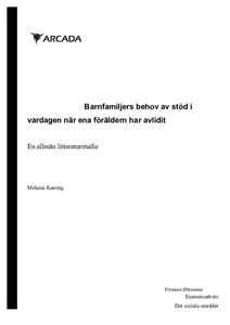 Detta examensarbete är ett beställningsarbete av Raseborgs stad och faller under ramen för förebyggande familjearbete. Arbetets titel är "Barnfamiljers behov av stöd i vardagen när ena föräldern avlider - en allmän litteraturstudie" och syftet med arbetet är således att belysa hurdant stöd en familj är i behov av i vardagen när ena föräldern avlidit. Frågeställningarna för arbetet är: Hur kan man som professionell stöda barnet i vardagen efter dödsfallet? Hurdant stöd behöver den kvarlevande föräldern efter dödsfallet för att i sin tur kunna stöda barnets sorgeprocess. Raseborgs stad ingår i det riksomfattande utvecklingsprogrammet LAPE (lapsi ja perhepalveluiden muutosohjelma) och därav är det aktuellt att belysa stöd för barnfamiljer i förebyggande syfte. Arbetets avgränsning är barnfamiljer med barn under skolåldern som förlorat en förälder och med stöd i vardagen avses stöd som familjearbete kan erbjuda. Tyngspunkt i arbetet ligger på hur man som professionell kan stöda hela familjen efter ett dödsfall, eftersom den kvarlevande förälderns omsorgsförmåga efter dödsfallet har stor inverkan på barnet. I arbetets teoretiska referensram behandlas sorg hos barn där bland annat sorgereaktioner och förståelse för döden tas upp, samt relationsarbete, bemötande, kommunikation och dialog. Metoden för arbetet är en allmän litteraturstudie och totalt har 10 artiklar inkluderats i arbetet. Resultatet av litteraturstudien presenteras i tre olika kategorier: stöd för barnet, stöd för den kvarlevande föräldern och den professionellas roll i sorgearbetet. Resultatet visar att barn har bäst förutsättningar efter dödsfallet om de fortsättningsvis lever i en god relation tillsammans med en resursstark förälder. Faktorer som ytterligare förstärker barnets förutsättningar är om man inom familjen har en öppen kommunikation med tillgång till stöd från det sociala nätverket samt tillgång till professionell hjälp vid behov. Resultatet för arbetet motiverar även till fortsatta studier inom området där förslagsvis professionella eller individer med erfarenhet intervjuas.