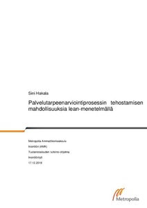 Insinöörityön tavoitteena oli kartoittaa mahdollisuuksia palvelutarpeenarviointiprosessin tehostamiseen lean-menetelmin. Tehostamismahdollisuuksien tarkoitus oli lisätä asiakastyytyväisyyttä ja mahdollisesti lyhentää läpimenoaikaa. Prosessin nykytila oli tarkoitus mallintaa ja ongelmakohtia oli tarkoitus etsiä ja tarkastella työpajoissa leanin menetelmin. Ongelmakohtien kartoituksen lisäksi tavoitteena oli etsiä mahdollisia ratkaisu- ja jatkotoimenpide-ehdotuksia.