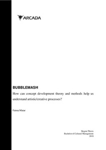 This study consists of 1) a concept for Bubblemash, a print and online art publication and 2) a report on the process of creating that concept. It explores what happens when an experimental and poetic idea encounters project management and concept development, using tools to support the idea of creating an artistic concept as a reaction towards western modern societal standards of what is socially acceptable and what is defined as good and valued. Bubblemash in its core is non-conventional and interactive magazine that have been inspired by artistic projects related to Dadaistic styles of communication. The concept is a reaction towards western modern societal standards of what is socially acceptable and what can be defined as good and valued. This study includes how the development of the project progressed after a team have been assembled, while it also offers an overview of the background, the methodology that have affected the concept as much as a practical plan of the execution of the project. Practical aspects such as the prototype, visual identity and a pitch for potential stakeholders have been excluded from this study due to the current stage of the project. This study emphasises the artistic freedom of not defying or questioning what exactly Bubblemash is, until we see the results. Mitt examensarbete är ett produktutvecklingsarbete som fokuserar på att besvara frågan: “How can concept development theory and methods help us understand artistic research?”. Studien beskriver ett koncept för en print- och online-tidning som heter Bubblemash. Studien går även igenom konceptets skapandeprocess. Med hjälp av projekthanteringsteori och konceptutvecklingsmetoder har det varit möjligt att skapa en rapport om projektprocessen. Bubblemash är en icke-konventionell och interaktiv tidning som inspirerats av konst relaterad till dadaistiska tendenser. Idén grundar sig en rädsla för att misslyckas. Publikationens syfte är att provocera läsaren och göra hen obekväm. Konceptet är en reaktion mot moderna samhällsstandarder. Studien inkluderar en beskrivning på hur utvecklingsprocessen har framskridit från idéfas till konceptutvecklingsfas. Studien använder “The Double Diamond method” som är en koncept- och projektplaneringsmetod. Studien erbjuder även en praktisk plan över genomförandet av projektet. Examensarbetet fokuserar på utvecklingen av konceptet Bubblemash. Studien behandlar inte praktikaliteter som distribution eller kommunikationen mellan Bubblemash och potentiella intressenter. Studien betonar friheten att fortsätta utvecklas och identifierar vikten av metodik i konstnärliga processer. -