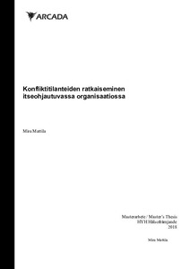 Konflikti, riitatilanne, erimielisyys voi olla yksi horjuttava tekijä ihmisen työhyvinvoinnille. Konfliktitilanteita on tutkittu suhteellisen paljon ja todettu, että esimies on keskeisessä roolissa niitten ratkaisemisessa organisaatiossa. Halusin tällä tutkimuksella tutkia, miten konflikteja ratkaistaan itseohjautuvassa organisaatiossa. Itseohjautuvuus on yksilön ominaisuus, joka tarkoittaa henkilön kykyä toimia omaehtoisesti ilman ulkopuolisen ohjauksen ja kontrollin tarvetta. Tämä tarkoittaa suurimassa osassa itseohjautuvassa organisaatiossa, että esimiehiä ei ole.