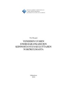 Kuluttajat odottavat tulevaisuudessa yhä enemmän ympäristöystävällisyyttä myös veneiden energiaratkaisuilta. Odotukset autoalalla ovat muuttuneet viime vuosina kohti yhä vähemmän kuluttavia ja päästöttömämpiä kulkuneuvoja ja veneala seuraa perässä. Kasvava ympäristöarvojen huomioiminen niin veneiden käyttäjien kuin yhteiskunnan taholta, polttoainekustannusten kohoaminen ja myös veneilijöiden kasvavat mukavuustarpeet asettavat uusia vaatimuksia veneiden energiajärjestelmille ja niiden tehokkuudelle. Vaasan ammattikorkeakoulu on lähtenyt yhteistyössä VTT:n kanssa toteuttamaan Tekesin veneohjelman osana tutkimushanketta, jonka tavoitteena on edistää uusia veneiden energiaratkaisuja ja sitä kautta tarjota uusia liiketoimintamahdollisuuksia. Opinnäytetyössä on tutkittu suomalaisten kuluttajien näkemyksiä ja odotuksia liittyen moottori- ja purjeveneiden ympäristöä säästäviin energiaratkaisuihin. Tutkimuksessa keskityttiin tutkimaan kuluttajien kiinnostusta sähkömoottoriin ja aurinkopaneeliin. Huomioon otettiin myös tuuligeneraattori ja vedenalainen akseligeneraattori. Tutkimuksen kautta saatiin tietoa venealan yrittäjille kuluttajien ja heidän asiakkaidensa odotuksista. Empiirinen aineisto kerättiin Helsingissä järjestettävien venemessujen yhteydessä. Vastaajia kyselyyn saatiin neljän päivän aikana 135 kappaletta. Tutkimuksessa selvisi, että ympäristöystävällisyys on myös venealalla kuluttajille tärkeää. Hinta on aina markkinoita ohjaava tekijä mutta ympäristäystävällisyydestä ollaan valmiita maksamaan jonkin verran lisähintaa. Kiinnostusta aurinkopaneelia kohtaan löytyi varsinkin suurissa veneluokissa. Pienempien veneiden parissa kiinnostus oli vähäisempää. Aurinkopaneelin jälkiasennus sai myös kannatusta. Suurin kiinnostus sähkömoottoriin löytyi pienien perämoottoriveneiden parista. Tuuligeneraattorin tulokset olivat ristiriidassa käytännön soveltuvuuden kanssa. Akseligeneraattori sai ideana taakseen lähes yksimielisen kannatuksen.