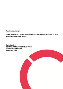(2026)Tämän opinnäytetyön tarkoituksena oli laatia toiminnallinen kokonaisuus, jossa tehtiin aloitte-levalle yritykselle liiketoiminta- ja henkilöbrändisuunnitelma. Aloitteleva yritys on perustamas-sa verkkokauppaa, jossa myydään ... -