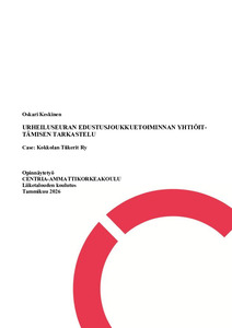 (2026)Tässä opinnäytetyössä tarkasteltiin urheiluseuran edustusjoukkuetoiminnan mahdollista yhtiöittämistä. Työ toteutettiin toiminnallisena opinnäytetyönä lentopalloseura Kokkolan Tiikerit Ry:n toimeksiannosta. Tarkastelun ... -