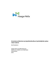 (2025)Opinnäytetyön tavoitteena oli selvittää, miten arvostava työyhteisö ja johtaminen tukevat työntekijöiden työssä jaksamista ja työhyvinvointia. Työssä erityisesti tarkasteltiin arvostavan ja psykologisesti turvallisen ... -