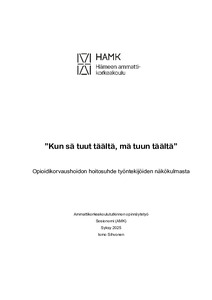 (2025)Opinnäytetyö käsittelee opioidikorvaushoidossa työskentelevien ammattilaisten ja heidän asiakkaidensa välistä hoitosuhdetta. Opioidikorvaushoito on 2000-luvun aikana vakiintunut osaksi suomalaista päihdehuoltoa ja samalla ... -