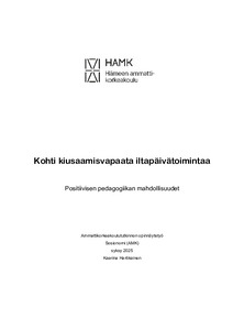 (2025)Opinnäytetyössä selvitettiin, millaista kiusaaminen on iltapäivätoiminnassa sekä miten sitä voisi ehkäistä yhteisöllisyyden, osallisuuden ja positiivisen pedagogiikan avulla. Tavoitteena oli tuottaa tutkimusmateriaalia ... -
