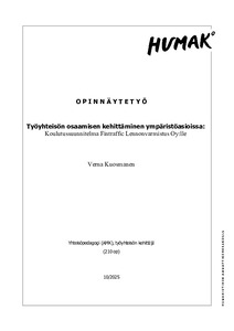 (2025)Tämän opinnäytetyön tavoitteena oli kehittää yhteisöllisyyttä, vuorovaikutusta ja yhteistyötä Ravintorengas Oy:n monimuotoisessa työympäristössä. Opinnäytetyö toteutettiin tutkimuksellisena kehittämistyönä, jonka kohderyhmänä ... -