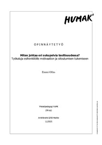 (2025)Tämä opinnäytetyö on tutkimuksellinen kehittämistyö, joka tuottaa esihenkilöille suunnatun oppaan eri sukupolvien johtamisen tueksi. Työssä kehitetään ymmärrystä eri sukupolvien motivaatiosta ja sitoutumisesta työelämässä ... -