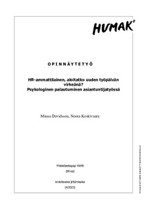 (2023)Tämän opinnäytetyön tavoitteena oli selvittää anonyymille kohdeorganisaatiolle toteutetun tutkimuksen avulla HR-ammattilaisten psykologisen työstä palautumisen tilaa ja käytössä olevia keinoja palautumisen edistämiseksi. ... -