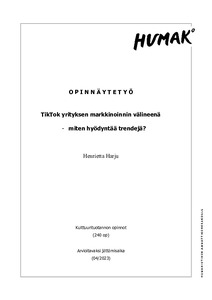 (2023)Tämä opinnäytetyö käsittelee sosiaalisen median sovellusta, TikTokia, ja miten sen sisällä kasvavia trendejä voidaan hyödyntää yrityksen markkinoinnissa ja sitä, onko se kannattavaa. Opinnäytetyön tutkimusmenetelmät koostuvat ... -