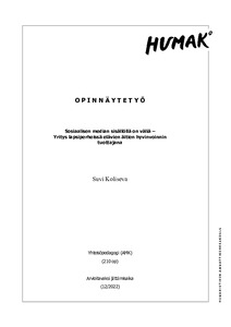 (2022)Tämä opinnäytetyö on työelämän kehittämistarkoitukseen tähtäävä tutkimus, jonka tarkoituksena on kehittää lapsiperhemedian tuottamaa sosiaalisen median sisältöä. Lapsiperheille suunnatut verkkomediat tavoittavat reaaliajassa ... -