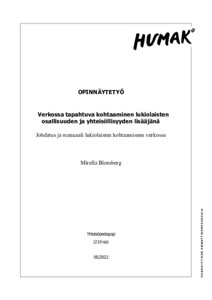 (2022)Opinnäytetyössäni tarkastelen verkossa tapahtuvan kohtaamisen mahdollisuuksia lukiolaisten yhteisöllisyyden ja osallisuuden lisääjänä. Lukioissa monet toimintamuodot on jo viety verkkoon, ja kohtaamista tapahtuu niin ... -