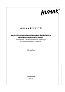 (2021)Tässä opinnäytetyössä perehdytään Covid19-pandemian vaikutuksiin Porin Teljän seurakunnan nuorisotyössä. Tutkimuskysymykset esitetään johdantoluvussa, ja niihin pyritään löytämään vastauksia opinnäytetyön aikana. Alussa ... -