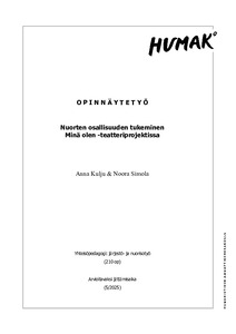 (2025)Tämän opinnäytetyön tavoitteena oli kartoittaa nuorten ajatuksia siitä, mikä tukee heidän osallistumistaan harrastusryhmässä ja selvittää miten nuorten osallistumisen tukeminen toteutuu Minä olen -teatteriprojektin ... -