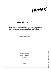 (2025)Opinnäytetyön tavoitteena on syventää ymmärrystä siitä, mitkä tekijät motivoivat tai estävät järjestöjen ja yritysten yhteistyötä Pirkanmaalla. Opinnäytetyössä keskityttiin työn tilaajana toimivan Artteli-kumppanuusyhdistys ... -