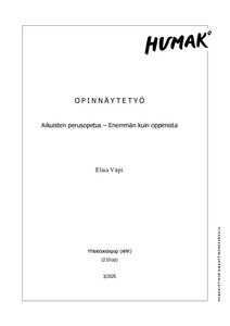 (2025)Tämä opinnäytetyö on tapaustutkimus, jonka tavoitteena oli kartoittaa maahanmuuttajataustaisten opiskelijoiden kokemuksia aikuisten perusopetuksesta. Tarkoituksena oli selvittää, miten opiskelua voitaisiin kehittää siten, ... -