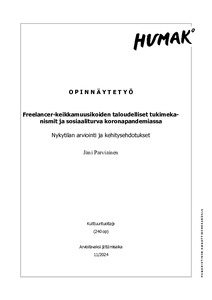 (2024)Opinnäytetyössä käytiin läpi freelancer-keikkamuusikoiden taloudellista tilannetta koronapandemiassa, freelancer-työtä ja sen erityispiirteitä sekä siihen liittyviä sosiaaliturvan haasteita. Freelancer-työ on monipuolista, ... -