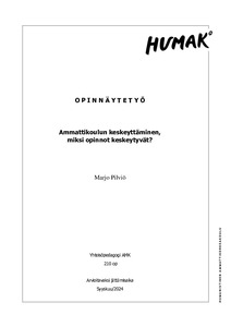 (2024)Kehittämistyöni keskiössä on opiskelijoiden opintojen keskeyttämisriski ammattikouluissa. Keskeyttämiset ovat tilastokeskuksen tilastojen perusteella tasaisesti kasvusuunnassa ja Covid-19 pandemian myötä myös etäopetus ja ... -