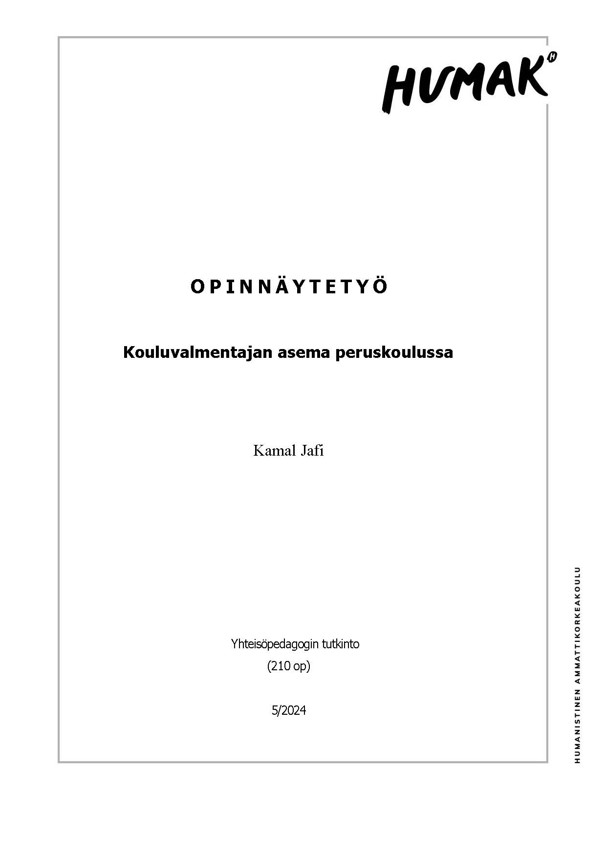 (2024)Tämän opinnäytetyön tavoitteena oli selvittää millaisia koulunuorisotyön tehtäviä, minkälainen rooli nuorisotyöntekijällä on kouluilla ja mitä asioita on tärkeä tilastoida kouluissa tehtävässä nuorisotyössä. Tämän ...