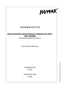(2024)Opinnäytetyön tilaaja on Suomen Latu ja se on toteutettu sen lastentoimintaan. Opinnäytetyön keskeisenä ajatuksena oli koota teoreettinen tietopohja siitä, mitä on hyvä huomioida, kun rakennetaan aikuisille suunnattua ... -